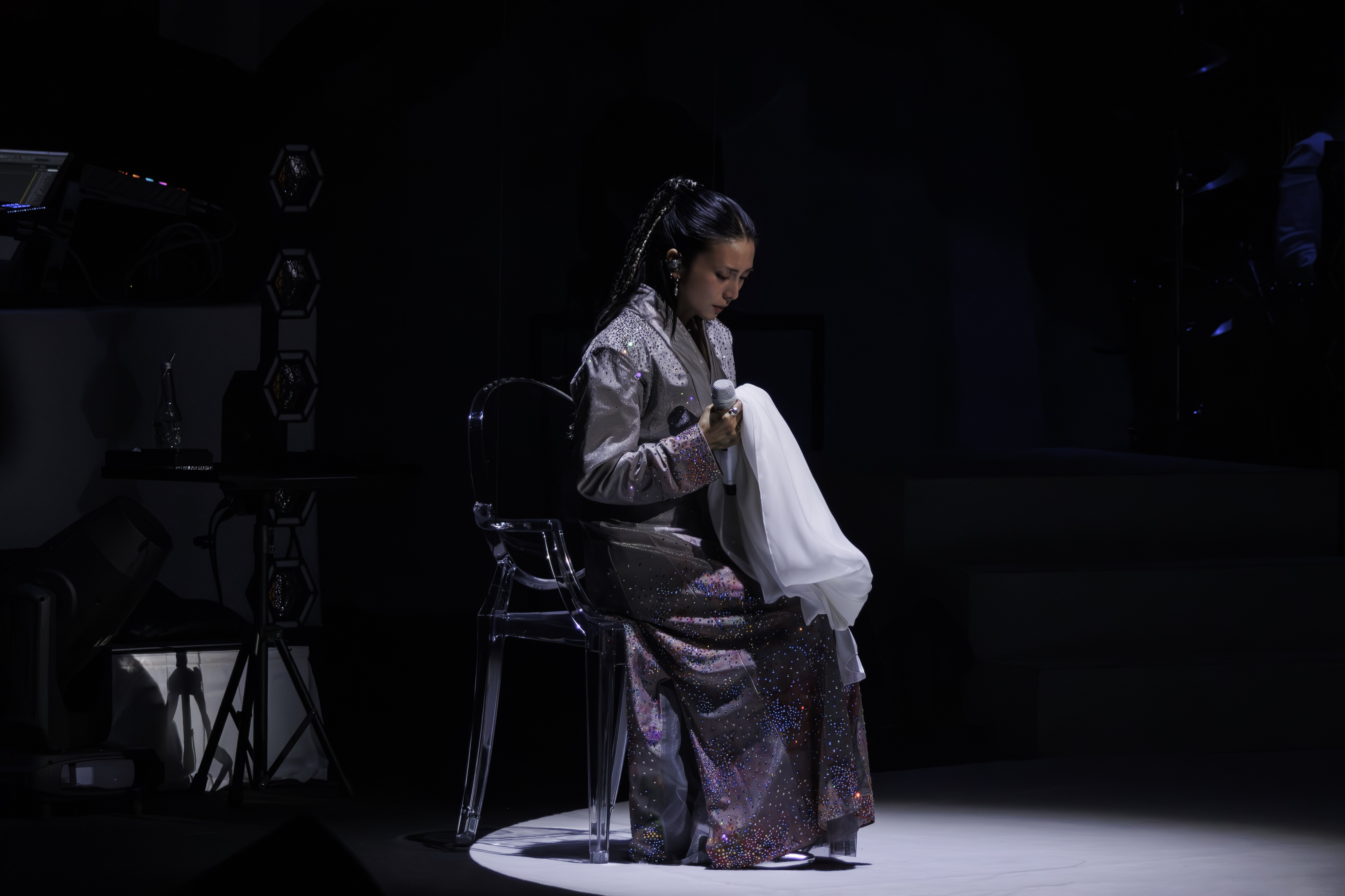 やがて、ステージ上に降ろされた透明な椅子にゆっくりと腰を下ろした彼女は、フードを深く被り、俯いたままの姿で「Déjà-vu」を歌い出した。